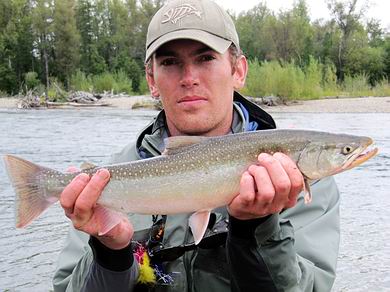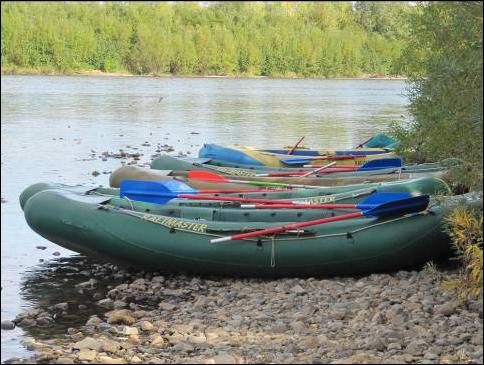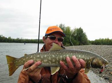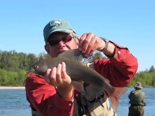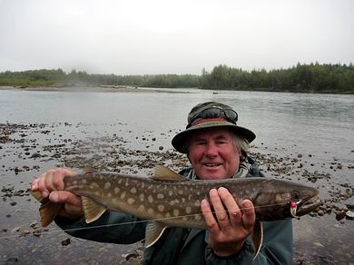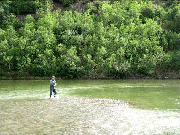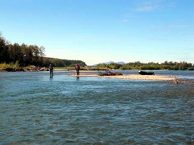 Der andere Teil floatet entsprechend vom Camp nach unten und wird abends wieder abgeholt. Am nächsten Tag wird gewechselt. Bei diesem Hochwasser jedoch wurden an den ersten beiden Tagen nur die Jetboote eingesetzt, mit Positionswechseln nach je etwa 2 Stunden fischen. Und das war gar nicht so leicht, denn bei richtigem Hochwasser sind die Fangstellen recht begrenzt. In ruhigen Abschnitten wurden zwar viele Saiblinge und einige Äschen gefangen, aber mit den (Silber)Lachsen und Kundzhas schien nicht viel los zu sein. |