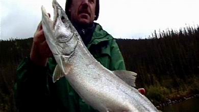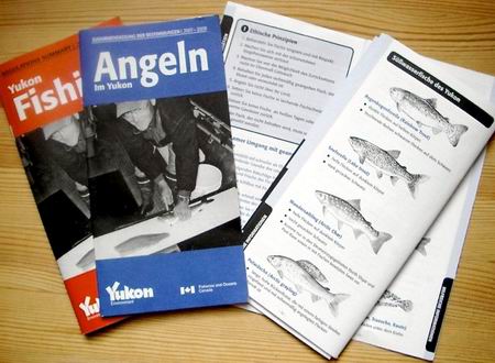 | Über alle fischereilichen Gegebenheiten informiert umfassend eine ausführliche Broschüre, die in deutscher, englischer und französischer Sprache kostenlos ebenfalls in nahezu allen Geschäften und Hotels zum Mitnehmen ausliegt. Aus ihr nur zwei wichtige Details: im Yukon ist an den meisten Gewässern das Fischen mit widerhakenlosem Einzelhaken vorgeschrieben. Drillinge sind nicht erlaubt. Vorhandene Widerhaken müssen entfernt oder angedrückt werden. Weiterhin gelten hier Zwischenschon- maße, welche die Entnahmemöglichkeiten der einzelnen Fischarten regeln. So dürfen z.B. Seesaiblinge (indianisch: Namaycush) nur bis zu einer Länge von 65 cm entnommen werden, während sie zwischen 65 cm und 100 cm tabu sind. Ab 1 m Länge darf ein Trophäenfisch behalten werden. Entsprechendes gilt für die Polaräschen. Das hat den Sinn, dass geschlechtsreife und damit fortpflanzungsfähige Fische zur Arterhaltung geschont werden. | ![]() |