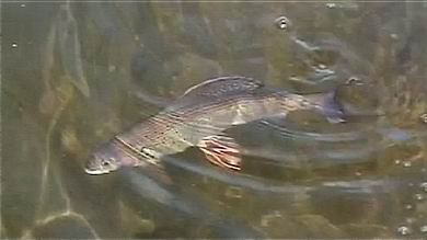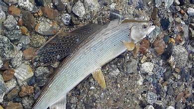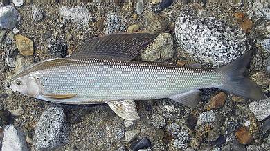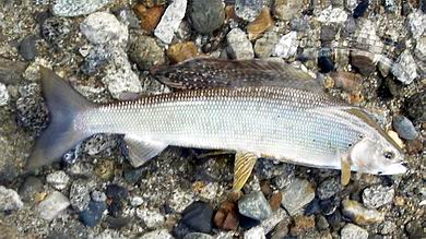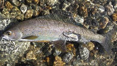 | Mit dem zurückgestoppten Wurf setzte ich die Fliege in die kräftige Bachströmung und ließ sie unter ständigem Schnurnachfüttern weit hinaustreiben, bis ein meist explosionsartiges Aufspritzen des Wassers mir den Anbiss einer Polaräsche verriet. Der daraufhin sofort gesetzte Anhieb bildete sodann stets den Auftakt zu einem recht aufregenden Drill, bedingt zum einen durch die Kampfkraft des Fisches als auch durch die Feinheit der Vorfachspitze zum anderen. Gerade beim Kampf im Wasser zeigten diese Atctic-Graylings ihre ganze Schönheit und Eleganz, und so fiel es nicht schwer, sie nach gebührender Bewunderung und einigen Erinnerungsfotos wieder in die Freiheit zu entlassen. | ![]() |