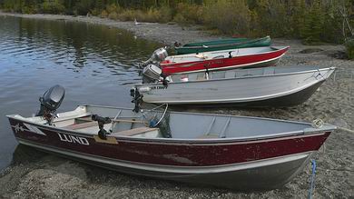 | Am Ufer liegen neben dem großen Motorboot für die weiten Transporte zwei Kanus und drei stabile Aluminiumboote mit Außenbordern, die den Anglern täglich samt Treibstoff zur Verfügung stehen. |