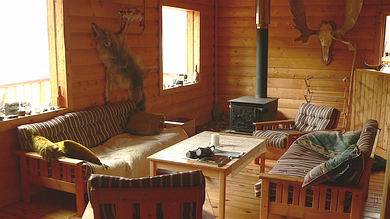 | Das Haupthaus umfasst 4 Schlafräume, ein großes Ess- und ein geräumiges Wohnzimmer, in dem man am Abend gemütlich zusammen sitzen und die Ereignisse des Tages noch einmal an sich vorüber ziehen lassen kann. Jagd- und Fischtrophäen an den Wänden erzählen von früherem Waidmanns- bzw. Petri-Heil. |