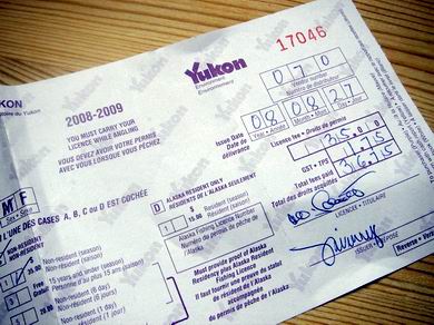 Wer im Yukon-Territorium fischen will, braucht - wie überall - einen Angelschein, den er beim Fischen bei sich zu tragen und auf Verlangen einem Fischerei- oder Naturschutzbeamten vorzuzeigen hat. Es wäre ein schwerer Fehler zu glauben, man könnte auf ihn verzichten, weil man ja fernab jeder Zivilisation zu fischen gedenkt. Auch in der tiefsten Wildnis wurde ich schon - so wie dieses Mal auch - von Beamten der Umweltbehörde kontrolliert. Verstöße gegen Fischerei- , Jagd- und Umweltgesetze werden in Kanada mit oft drastischen Strafen geahndet. Die Angellizenz erhält man problemlos gegen Vorlage etwa des Reisepasses bei den meisten Sport- und Supermärkten, z.B. „Canadian Tire“, Tankstellen und Highway-Hotels. Sie kostet für Touristen 35,-- (plus 1,75 MwSt.) Kanadische Dollar und ist vom 1. April des laufenden bis zum 31. März des kommenden Jahres gültig. |