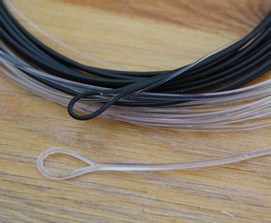 b) sehr kurzes Poly Leader, schnell sinkend, verjüngt ab Schnurschlaufe (0,93 mm) bis Spitze (0,38 mm), Gewicht: 2,6 Gramm |