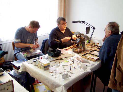 | Die Veranstalter hatten ein derart umfangreiches Programm zusammengestellt, dass wirklich keine Wünsche offen blieben. Im "großen" Saal, der nach "Bestückung" mit allen Akteuren etwas aus den Nähten zu Platzen schien, waren trotz einiger, leider sehr kurzfristigen Absagen, nicht weniger als 12 Fliegenbinder den ganzen Tag fleißig am Basteln der kunstvollen, künst- lichen Insekten. | ![]() |