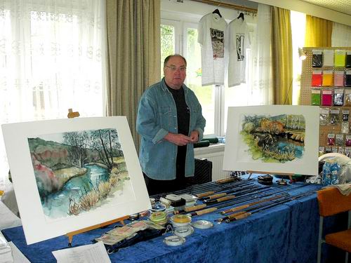 Neben dem Tombola-Stand, einem vermutlich für viele Besucher ziemlich wichtigen Stand & Veranstaltungsteil, auf den wir weiter unten noch näher eingehen, präsentierte Hans-Werner Schneider (links) eigene Aquarelle und einen Stand mit Gebrauchtgeräten. Bei ihm konnte so mancher Besucher ein Schnäppchen machen. |