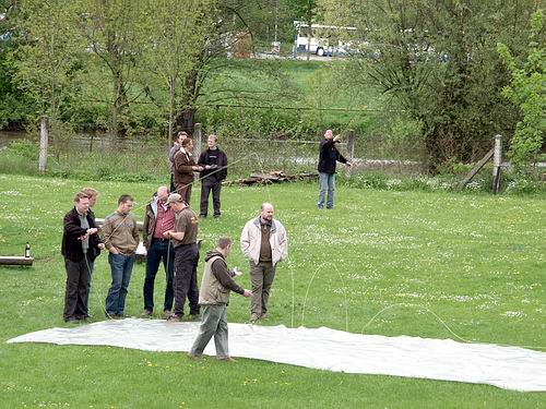 | Auf dem weiträumigen Freigelände, direkt am Ufer der Ilm, zeigten die Fliegenwerfer ihr Können und vermittelten dies gern dem interessierten Besucher. Für die Vorführung von Spezialwürfen wurde wieder eine nasse Plane ausgerollt. Ständige Akteure hier waren die Jungs von "Fisch im Netz", Tobias Baranski (Scierra), Olaf Kurth, Hendrik Wiegand und weitere. | ![]() |
