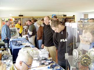 Auch auf Eigenheiten von Direkt Drive, Anti Reverse und Dualmode- Rollentechniken wurde näher eingegangen. Interessierte konnten sich von der Wirkungsweise mit praktischen „Drilltest’s“ überzeugen. Mit dabei war, neben der in 2004 neuen Henschel- Großkernrolle, auch wieder "Das Unikum": eine "wirkliche" Groß- kernfliegenrolle... (Foto oben rechts...).