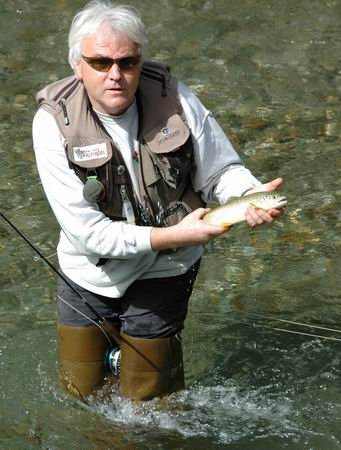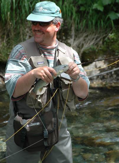 Hier – an der Catch & Release- Strecke - sollten wir nun für die nächsten Stunden von einem Begeisterungssturm in den nächsten verfallen. Innerhalb 2 Stunden fingen wir wohl 25 Bachforellen zwischen 25 – 40 cm – mit verschiedensten Fliegenmustern von schwarz über braun und beige bis grau - an ca. 2-3m langen 14er-16er Vorfächern. Die Größe der Fliegen war uninteressant – es wurde alles genommen. Nur die größten