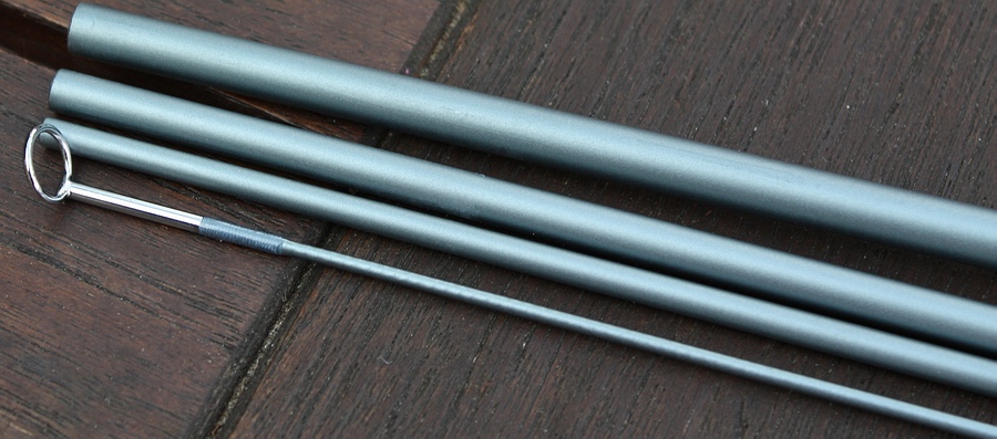 Teilung und Maße: Vierteilige Fliegenrute, Länge 8'6" (zusammengesteckt und nachgemessen 260 cm), vier nahezu gleichlange Teile a. 69 cm Länge. Das Gewicht der Rute beträgt 100 Gramm. Blankdurchmesser über dem Griff: 7,8 mm, Blankdurchmesser an der Rutenspitze: 1,7 mm. Länge Transportrohr: 74 cm, Gewicht Transportrohr (leer): 565 Gramm. Ausstattung: Schlanker, eisblaugrauer, glanzlackierter Blank aus 36T/40T-Carbon. Die Verbindungen der Einzelteile wurden als gut passende Überschubverbindungen ausgeführt, die oberen Enden der Ruteneinzelteile wurden gegen das Eindringen von Schmutz und Wasser abgedichtet. Jeweils an den oberen Hülsen befinden sich (einseitig) Typenbeschriftungen. |