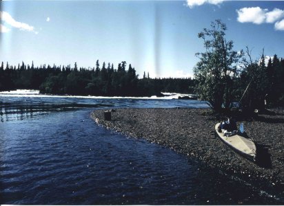 Die nächsten Tage bleibt das Wetter schlecht, so daß ich die Fischerei im Tikchik Lake nicht weiter erforsche. Nach der Querung des Tikchik Lake bei Sturm und Regen erreiche ich den Auslauf in den Nuyakuk River. Beim Anblick der Anglerlodge, die kurz unterhalb der ersten Stromschnelle gelegen ist, übermannt mich der Wunsch nach einer heißen Dusche und einem Abend am Kamin. Doch nur eine Nacht in dieser Lodge würde meine Reisekasse völlig sprengen. Nachdem die erhoffte Einladung zum Kaffee ausbleibt, suche ich mir einen Lagerplatz weit außerhalb der Sichtweite der Lodge, setze mich im strömenden Regen ans Feuer und genehmige mir einen Extra-Schluck aus der Wiskey-Ration. In der Nacht fange ich einige Rainbows und setzte direkt am nächsten Morgen die Fahrt fort zu den Nuyakuk Falls.