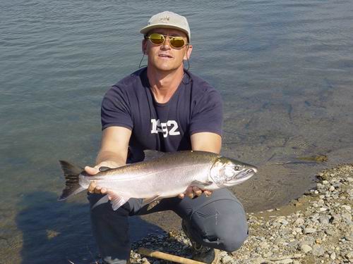 Dort, wo die Flüsse zusammenfließen, haben wir einen große hochgelegene Sandbank - zum Campen ideal - und einen riesigen tiefen Pool, der nach Lachsen nur so riecht. Das könnte richtig gut werden hier!!! Nachdem unser Camp steht und wir uns etwas gestärkt haben, wollen wir nun mal schauen, ob was im Wasser ist. Wir satteln unsere Ruten und versuchen unser Glück. Nach wenigen Würfen knallt es an meiner Rute gewaltig. Die Schnur beginnt sich bis fast zum Zerreißen zu spannen, bevor die Bremse anfängt zu schreien und schon bohrt sich ein guter Silberlachs durch die Wasseroberfläche. Meinen Jungs fällt die Kinnlade runter - der erste Silver ist gefangen und der Bann ist gebrochen. Heut Abend gibt es lecker Fisch! Leider ist es der einzigste Silber für heute. Martin und Hermann fangen aber zum Ausgleich einige gute Rainbows, Dollies und Charrs mit über 60 cm!!! What a Day !! Hier werden wir noch ein paar Tage bleiben. |