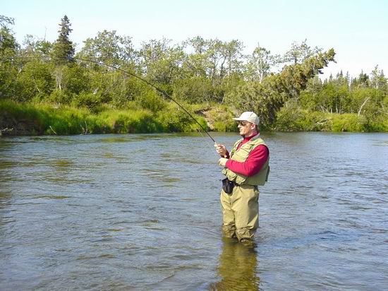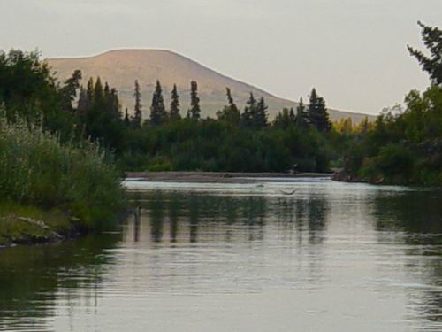 | Heute war ein besonders schöner Tag und wir hatten beinahe 30 Grad gehabt: Unsere ständigen Begleiter, die Balck Flies, sind da mit uns ganz einer Meinung und beglücken uns in einer derartigen Stückzahl und Aktivität, das uns nur unsere Buckshirts noch einigermaßen vor Ihren Attacken schützen. Nach einer halben Stunde Fußmarsch entdecken wir Hermann in der Ferne, der uns auch sieht und wie wild winkt. Als wir bei ihm sind, verstehen wir, warum er so lange Zeit weg war. Wir stehen an einer Flachwasser- zone, gegenüber ist das Wasser etwa einen Meter tief und da stehen Sie, hunderte von Silberlachsen !!! Es ist eine wunderbare Stimmung am Wasser: Die Sonne beginnt gerade hinter den Bergen zu verschwinden, es ist absolut windstill und vor uns stehen hunderte von Lachsen. Jedes mal, wenn die Fliege auf das Wasser klatscht und abzusinken beginnt, ist es wie im Aquarium zu Fischen. | ![]() |