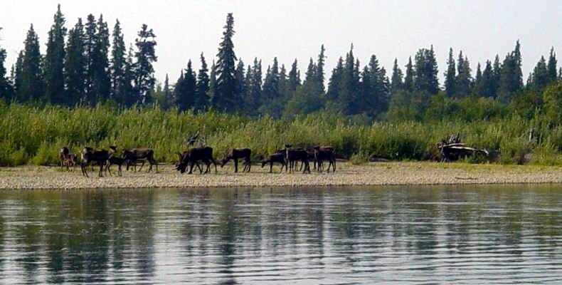 Wir packen unsere Sachen und fahren nach drei wundeschönen Angeltagen weiter zu unserem nächsten Hotspot. Wärend wir gemütlich den Fluß herunter floaten, kommen uns wieder unsere Jungs entgegen. Wir winken uns gegenseitig zu und floaten an Ihnen vorbei. In diesem Streckenabschnitt ist der Fluß sehr langsam fließend und wir haben etwas Probleme Strecke zu machen, ohne die Stechpaddel einzusetzen. Unterwegs passieren wir noch eine verlassene Lodge, bis wir nach viereinhalb Stunden an unserem nächsten Lagerplatz ankommen. Da es noch recht früh ist, beginnen wir sofort mit dem Fischen und bauen unser Camp erst später auf. Nach einer Stunde fischen, müssen wir jedoch feststellen das kein einziger Fisch im Fluss ist und die Stelle deutlich flacher ist als ich sie Jahre zuvor angetroffen hatte. Noch dazu eine sengende Hitze, das Wasser ist warm nicht gerade optimal für die Lachse. Nachdem wir unser Camp errichtet und etwas gegessen haben erkunden wir die Gegend mit unseren Ruten, doch man sieht keinerlei Aktivitäten oder Fische im Wasser. Aber wir können eine Herde Karibous beobachten, die uns kaum wahrnehmen. |