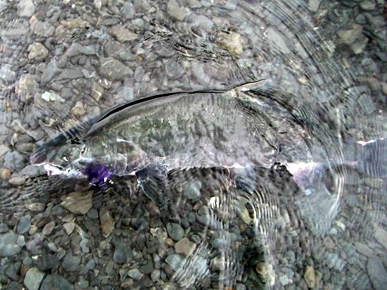 | ... und sind ganz schön platt, als wir nach weiteren zwei Stunden unser Boot beladen haben, um los zu fahren. Aber es ist zu wenig Wasser im Bach, um zu floaten, also müssen wir ziehen!!! Dies ist oft das Problem, wenn man zu weit im Oberlauf eines Flusses einsetzt oder wenn einfach zu wenig Wasser im Bach ist, weil es zu wenig geregnet hat. Wir können die ersten Kings sehen und erfreuen uns an Ihren Anblick. Sie sind zwar schon knallrot aber insgesamt noch in recht guter Verfassung. Diese Giganten von zwanzig Pfund und mehr kämpfen sich durch knöchelhohes Wasser, um sich zu vermehren und ihrem Schicksal entgegen zu schwimmen: dem Tod. | ![]() |