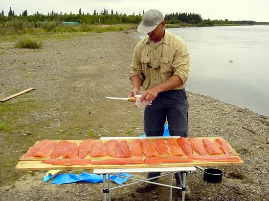 Mann beginnt zu strippen und einer oder mehrere der Fische brechen aus und attackieren den Köder bis einer von Ihnen hängt. Es flogt ein nervenaufreibender Drill (wenn da nicht immer so viele Mücken wären!!!!), bis der Fisch gelandet ist. Ich habe meine Videokamera dabei und filme einige schöne Sequenzen. Nach etlichen Fischen wird es nun dämmerig und wir entschließen uns, zum Camp zurück zu gehen. Ein Wahnsinns-Angeltag geht zu ende. Der Fußmarsch hat sich wirklich gelohnt. Wir genießen den Abend am Lagerfeuer bei ein paar Gläßchen Rotwein, typisch amerikanisch aus dem Plastiksack, der aber spätestens nach dem zweiten Glas vorzüglich schmeckt….. In der Nacht wird es recht kalt, mein Thermometer zeigt gerade mal noch zwei Grad, als wir ins Bett gehen. Gut wenn man den richtigen Schlafsack dabei hat, denke ich mir gerade noch und beginne schon von den vielen Lachsen zu träumen. Das Leben hier draußen kann so schön sein. |