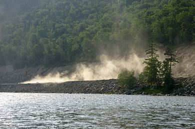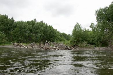 | Die erodierten Bäume können sich aber auch zu logjams (engl. log = Stamm, jam = Stau) verklausen und Flussarme, ja sogar den gesamten Fluss versperren. Für das an holzleere mitteleuropäische Flüsse gewohnte Auge wirken diese Strukturen sonderbar, doch die ökologische Bedeutung von Totholz kann fast nicht überschätzt werden. Logjams können über Generationen bestehen bleiben und uralt werden. Sie rauben dem Fluss seine gestalterische Kraft und werden nur extrem selten wieder erodiert, am ehesten wohl seitlich durch Verlagerung von Nebenarmen. Bei Hochwasser wirken sie wie ein Filter und wachsen stromauf, werden riesig. Für mich als flussmorphologisch Interessierten sind logjams spektakuläre Fotomotive, als Bootfahrer bedeuten sie aber primär zweierlei: Gefahr und Mühsal. Gefahr, wenn sie stark unterströmt werden, sodass der unachtsame Fahrer mitsamt zerfetztem Schlauchboot darunter gezogen und im Holz hängend ertrinken kann. Mühsal, wenn sie den gesamten Fluss überspannen und umtragen (portagiert) werden müssen. |