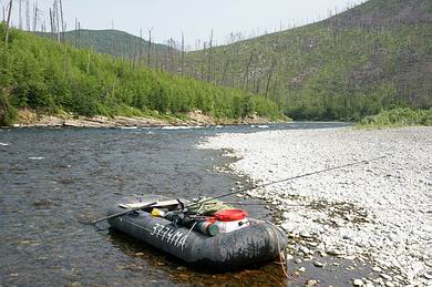 | schöne Lenok-Angelstelle... | etwas unordentliches „Cockpit“ mit Zweihandrute zum Taimen- und 6er Rute zum Lenok-Fischen... |