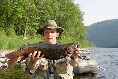 | Nach einigen mühelos befischten Kilometern strafft sich die Leine, ein starker Zug krümmt die Rute und dreht mein Boot stromauf. Hat sich ein sibirischer Taimen an die Trockenfliege verirrt? Meine Körperkoordination wird auf eine harte Probe gestellt: Die Rute zwischen die Zähne gepresst, versuche ich einerseits, die Leine gestrafft zu halten, und andererseits mit beiden Händen rudernd das Ufer zu erreichen, um den großen Unbekannten in Ermangelung eines Keschers zu stranden. Das Kunststück gelingt und bald halte ich das Prachtstück in Händen, es handelt sich um einen 3 kg schweren “Stumpfnasen-” Lenok mit bulligen Proportionen und riesigen schwarzen Punkten. |