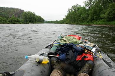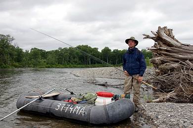 | Nach ca. 5 Stunden Taxifahrt erreiche ich den Zubringer Gobilli, der einige Kilometer stromab in den Anyui fließt. Hier blase ich das Boot auf, belade es und verabschiede mich vom Fahrer. Es stellt sich schlagartig jene seltsame Mischung aus Euphorie und Respekt vor dem Kommenden ein, die man als alleine Reisender besonders intensiv genießen kann. Mit guter Geschwindigkeit geht’s rasch die paar Kilometer bis zum Anyui hinunter. Herrlich, wie sich im Oberlauf meine Trockenfliege während des Driftens schräg vor dem Schlauchboot hertreiben lässt. Überaus praktisch in einem umbekannten Fluss, um die Standplätze der Fische auszukundschaften. Einige hundert Meter lange “dead drifts” sind möglich, ohne dass die Fliege furcht, weil sich der breite Lauf des Flusses nur leicht pendelnd durch die dicht bewaldeten Hügel schlängelt. Am Ende des Vorfachs hängt eine Lenkovka-Variante, Hakengröße 4. Ein russisches Fliegenmuster, das gerade schwärmende riesige Köcherfliegen und Steinfliegen imitiert. |