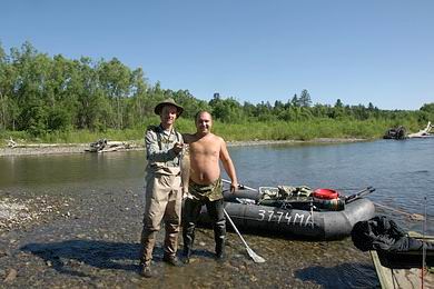 | Kaum glauben kann ich, als eine Motorzille um die Flusskurve kommt und sich die drei Insassen als „Ribinspektor“ (Fischereikontrolle) zu erkennen geben. Glücklicherweise kann ich die gewünschten Papiere vorweisen, und die drei Herren sind genauso verblüfft über einen Österreicher wie ich über die Kontrolle hier mitten in der Wildnis. Tatsächlich dürften die Beamten selbst die ärgsten „Fischwilderer“ sein, in ihrem Boot liegen neben 3 Spinnruten eine Handvoll Lenok. Für ein zünftiges Foto drückt mir der „kapitalste“ Fischinspektor ganz ungeniert einen Lenok in die Hand. |