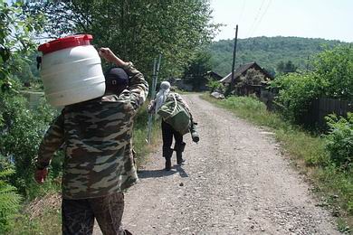 Am nächsten Morgen ist Spurensuche angesagt. Wirre Wildwechsel durchkreuzen das ansonsten undurchdringliche Dickicht, manche auch mit verheißungsvollen, mehr oder weniger frischen menschlichen Trittsiegeln. Nach einigen Stunden des Herumirrens bin ich bereits verzweifelt: Keine der Spuren mündet in einen erkennbaren Weg in die vermutete Richtung zum Dorf, die meisten lösen sich wieder auf oder enden an nicht durchwatbaren Nebenarmen. Schließlich treffe ich zum Glück auf einen fischenden alten Mann, der mir voraus schreitend den Weg weist. Und tatsächlich, nach längerem Marsch lichtet sich der Wald und es tauchen die typisch russischen Kartoffeläcker und ein verschlafenes Dorf aus Holzhäusern auf. Ich steuere das „Gemeindeamt“ an, wo mir die freundliche Bürgermeisterin einen Tee anbietet und zwei Gehilfen, die mit mir die Packsäcke aus dem Wald tragen. Ausländer dürften sich hierher wohl nur extrem selten verirren. Mit einem per Telefon bestellten Taxi geht’s von diesem Vorposten der Zivilisation durch endlose Schotterpisten wieder zurück nach Chabarowsk. |