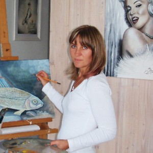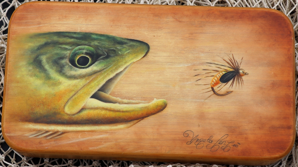 Auch ein gerader Lebensweg zeigt mehrere Möglichkeiten ans Ziel zu kommen, und das Herzensziel hieß nun einmal Malen. So ging sie den Weg zur bildenden Kunst selbstverständlich und konsequent. Seit dem Jahr 2004 betreibt A.L. ihre Kunst. Sie malte mit klassischen Ölfarben seit 2004 vorwiegend Landschaften nach alten Ansichten und Tierportraits. Fliegendosen bemalt sie seit 2006. Zufällig (oder gibt es wirklich Zufälle?) lernte Angela Leute aus der Fliegenfischerszene kennen. Bekanntlich sind Fische auch Tiere, somit ein begehrtes Motivmaterial für Angela. |