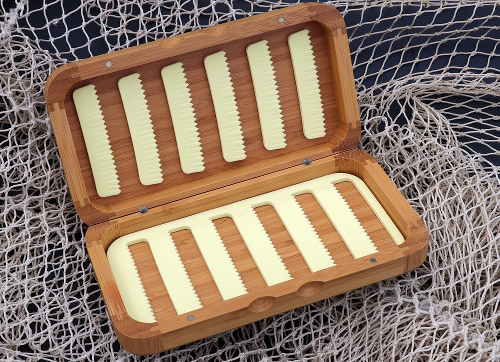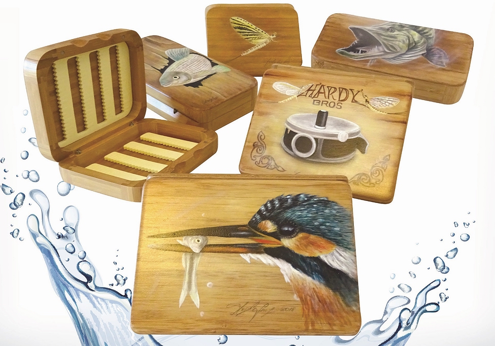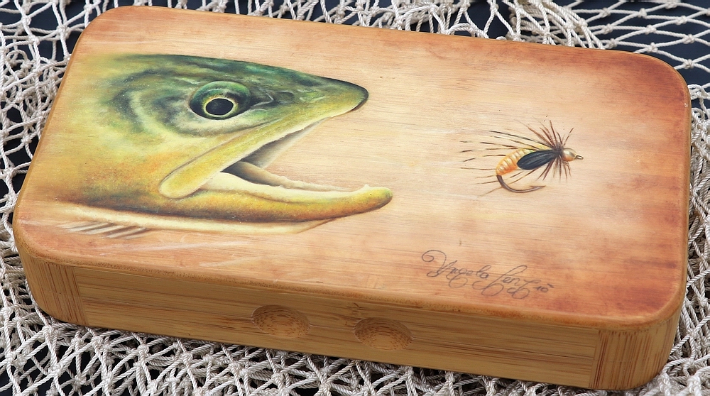 In diesem Beitrag seht ihr einige Detailbilder dieser Fliegendosen und technische Details. Jede dieser schönen Dosen wurde von Hand bemalt und mit einer Endversiegelung versehen. Diese erlaubt es, die Dose auch mit ans Wasser zu nehmen. Zur Ausstattung: die kunstvollen und sehr präzise und solide gefertigten Dosen aus Bambus besitzen 2 eingebohrte Scharniere und einen Verschluss mit 2 ebenfalls eingebohrten Magnetschnappern. Es gibt standardmäßig 2 Dosengrößen: eine große Fliegendose a. 19,7 x 10,5 cm und eine kleine Fliegendose a. 13 x 10 cm. Die Preise fangen bei € 95,- an und hängen vom Zeitaufwand der Malerei ab…. also z.B. eine Dose mit einem Fisch oder Eisvogelmotiv kostet € 290,-. Einen Überblick über die Vielzahl der Motive findest du in der Bildergalerie (Link siehe unten). Neben den fertigen Motiven im Programm sind Auftragsarbeiten ebenfalls möglich und werden nach Aufwand verrechnet. Die Lieferzeit beträgt wegen der individuellen Anfertigung rund 5-6 Wochen (lange Trocknungszeit der Ölfarbe). Jede Dose kann auch mit Initialen versehen werden, dies ist für € 6,- Aufpreis möglich. Das Innenleben jeder Fliegendose besteht aus geschlitzten Foamstreifen zur Aufnahme von theoretisch bis über 200 Fliegen, je nach Fliegengröße auch weniger (am Beispiel der großen Dose mit schönem Forellen- und Nymphen Motiv, die auf den letzten 4 Bildern gezeigt wird. Diese kostet € 190,- und wiegt 222 Gramm). |