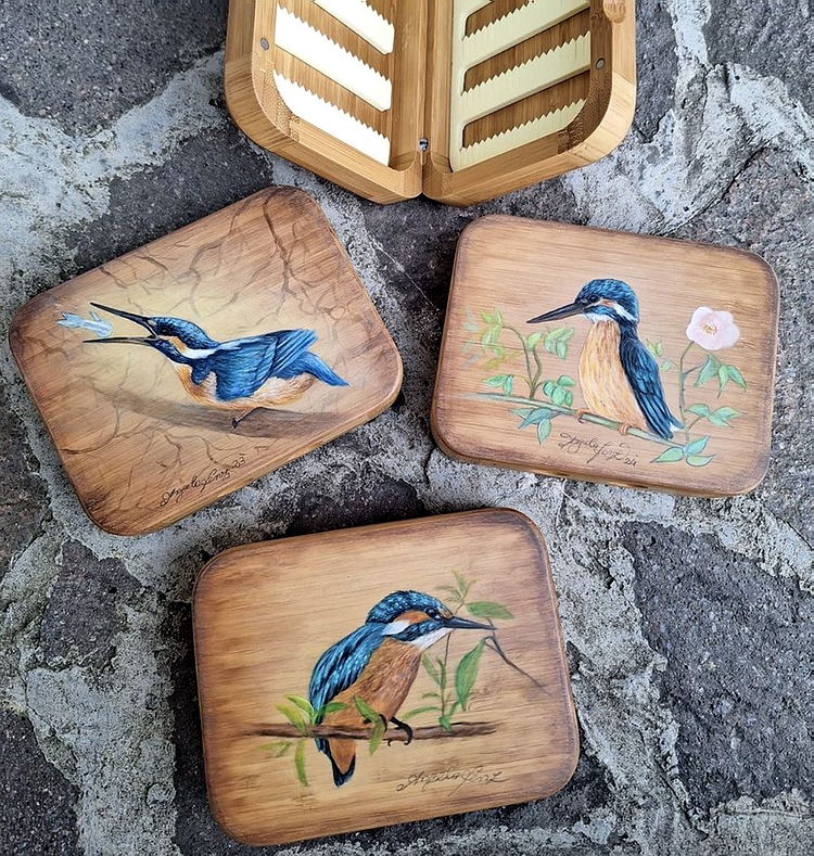 Da die künstlichen Fliegen, für deren Aufnahme die Dosen bestimmt sind, weitgehend dem lebenden Insekt gleichen sollten, ist die Intension, lebende Insekten als Motivvorlage zu verwenden aus dimensionalen Gründen fast unmöglich. Noch dazu fehlte ihr anfänglich jedes Wissen. Welche der Fliegen und Nymphen sind geeignete Köder? Welche Fliege schwärmt zu welcher Jahreszeit? Damit klärt sich die Frage welche Fliege, wann ans Vorfach, auch das regionale Wo ist ein wichtiges Modul. Das hieß alle verfügbare Literatur nach Informationen durchzukämmen. Außerdem sind Fliegenfischer zumeist Ästheten, die Schönheit der Fliege ist eine nicht zu vernachlässigbare Eigenschaft der Malerei. Beliebte Motive, neben den klassischen Fliegen und Nymphen, sind Eisvögel und natürlich der begehrte Fang – der Fisch. |