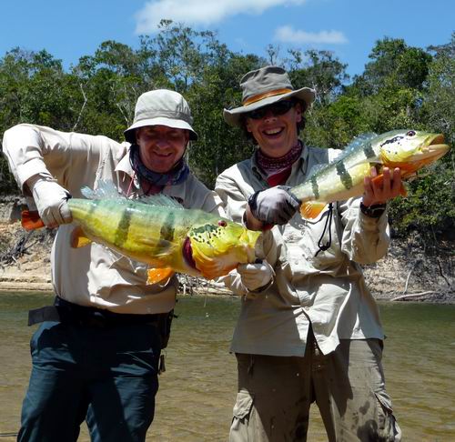 Der seltenere Aruana oder Gabelbart wird mit der gleichen Ausrüstung gefangen, hingegen sind die Fliegen etwas langsamer einzustrippen. Häufig werden die Fliegen von verschiedenen kleineren Fischen attackiert. Besonders die Piranha knabbern gerne an den Streamern, nicht selten werden sie richtig gehend „gerupft“! Tipp: Streamer aus Kunstmaterialien einsetzen. Auch Knoten und Verbindungen werden von den Piranhas gern zerbissen, was zu Vorfachverlust und Schnurbruch führen kann. Der Fischreichtum und die Artenvielfalt der Agua Boa Gewässer ist enorm. Wer einmal einen kleineren Forellenstreamer fischt, kann wahre Überraschungen erleben. |