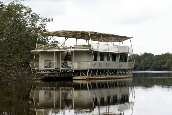 Als Alternative zur Lodge bietet Agua Boa einen Aufenhalt im Hausboot an, welches etwa 50 km flussaufwärts ankert. Hier ist das Naturerlebnis noch intensiver. Trotzdem muss nicht auf Annehmlichkeiten verzichtet werden. Das Hausboot verfügt über 6 Einzelkabinen mit Bad/Dusche/WC. Für das wohl der Gäste sorgt das Küchen- und Serviceteam. Drei Guides mit ihren Motorbooten führen die sechs Angler zu den besten Angelstellen. komfortable Agua Boa Lodge |
