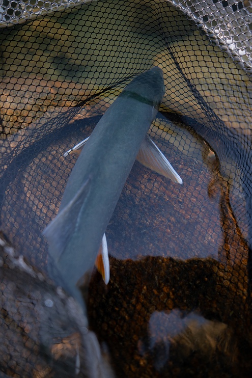 Als Trockenfliegenpurist hat man es mit den bunten Saiblingen oft nicht leicht. Den Großteil ihres Nahrungsbedarfs decken selbst kapitale Exemplare mit kleinen und kleinsten Nymphen, die oft in scheinbar unendlichen Massen vorkommen. In vielen Gewässern ist trotzdem eine gute Sichtfischerei möglich, da die Saiblinge zum Fressen oft in flache Bereiche mit hellem Sandgrund ziehen und dort erspäht werden können. Mit einer unbeschwerten oder leicht beschwerten Nymphe angeworfen, sind diese aktiv fressenden Fische oft gut zu überlisten. Hierbei gilt es die Route des Fisches und die Sinkbewegung der Nymphe so zu berechnen, dass der Fisch die Imitation genau ins Sichtfeld bekommt. Verleibt man der Nymphe dann ein klein wenig Leben ein, oft reicht ein Zittern mit der Rutenspitze, kommt der Biss oft unmittelbar. Eine klassische Saibling-Fliegendose ist dementsprechend mit verschiedenen Nymphen in allen Größen, Beschwerungen und Farben gefüllt und nur mit etwa 20% Trockenfliegen. |