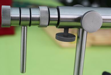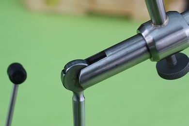 Schauen wir uns den Marlin nun näher an, von unten nach oben. Alle Feststell- und Rändelschrauben sind aus Metall. Der Bindestock steht mit seiner massiven Bodenplatte sicher und kippelfrei auf dem Tisch. Zwei Magnetfelder oben sorgen dafür, das z.B. Haken da liegen bleiben, wo sie sollen. Der Hauptarm des Marlin wird in der dafür vorgesehenen Halterung der Bodenplatte passgenau aufgenommen und mit einer Feststellschraube fest fixiert. Da der Hauptarm am unteren Ende eine Ausfräsung aufweist, kann die Bodenplatte auch dann nicht herausrutschen (und herunter fallen), wenn der Bindestock am oberen Teil gegriffen und durch die Gegend getragen wird. Allerdings ist auch im in der Bodenplatte fest fixierten Zustand des Bindestockes ein minimales, stark |