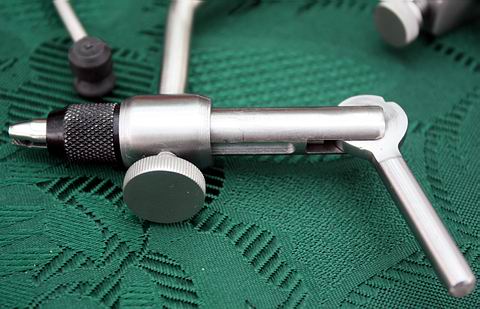 - Preis: im passgenauen Kunstleder- Reißverschluss-Etui: 149 € Unser Eindruck: Der Piranha ist so solide wie der Marlin - nur dessen verkleinerte Ausführung. Wie bei diesem sind alle Feststell- und Rändel- schrauben aus Metall. Der Bindestock steht mit seiner massiven Bodenplatte aus poliertem Stahl sicher und kippelfrei auf dem Tisch. Alternativ kann die mitgelieferte Tischklemme verwendet werden, deren Schraubbereich eine Plattenstärke von 0 bis 42 mm abdeckt. Die beiden Magnetfelder in der Bodenplatte, die der Marlin aufweist, fehlen beim Piranha. Der Hauptarm des Bindestockes wird in der dafür vorgesehenen Halterung der Bodenplatte passgenau aufgenommen und mit einer Feststellschraube fest fixiert. Da der Hauptarm wie auch dessen anschraubbare Verlängerung am unteren Ende |