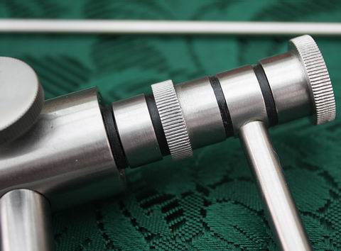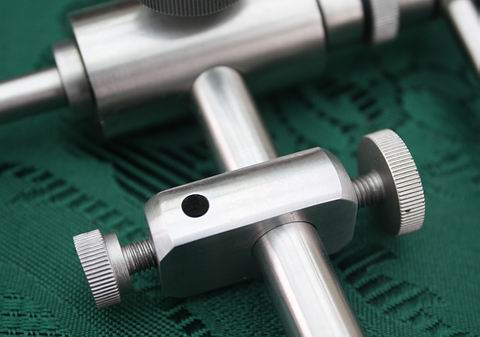 eine Ausfräsung aufweisen, kann die Bodenplatte auch dann nicht herausrutschen (und herunter fallen), wenn der Bindestock am oberen Teil gegriffen und durch die Gegend getragen wird. Die Arbeitshöhe beim Piranha beträgt (inklusive montierter Achsenverlängerung a. 9,6 cm) rd. 24,5 cm (Gesamthöhe 27 cm). Ein Bobbin(ab)hänger lässt sich in der Höhe über den gesamten Hauptachsenbereich und seitlich über 21 cm, sowie auch im Winkel beliebig verstellen. Der waagerechte Arbeits-Arm des Marlin ist bei voll ausgefahrenem Bindekopf 19,5 cm lang. Mit drei Rändelschrauben und zwei Rändelmuttern lassen sich die Widerstände und Fixierungen des 100%ig korrekt rotierenden Armes für jeden gewünschten Bedarf einstellen, egal, ob im Rechts- oder Linkshandbetrieb. |
