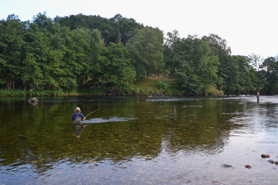 Insgesamt blieb die Fischerei allerdings schwierig, was sich z. B. in dem völligen Fehlen von Fehlattacken (Anfasser, Klopfer, etc.) spiegelte. Mit etwas Glück kam nach vielen Stunden ausdauernden Fischens aber doch ein überraschender Biss, ein Lachs nahm die Schnurschlaufe und hängte sich an der kleinen Doppelhakenfliege auf. Trotz der vorsichtigen, eher zupfenden