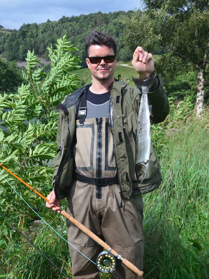 Auf diese Weise konnten wir „das Schöne mit dem Schönen“ verbinden und einen guten Rundumblick über den gesamten Süden des Landes bekommen. Die Anreise erfolgte regulär über Dänemark und mit der Fähre von Hirtshals nach Kristiansand (von aus dort aus dauert die Weiterfahrt zum Bjerkreim noch ca. 2,5 Stunden). Die Rückfahrt erfolgte mit der Fähre von Oslo in 20 Stunden direkt nach Kiel (eine äußerst erholsame, obgleich nicht ganz günstige Alternative). Die zwei Wochen am Bjerkreim verbrachten wir, zusammen mit unseren guten Freunden Zora, Michael, Dieter und HP, vorwiegend fischend, aber auch mit Ausflügen zu den schönen umliegenden Sehenswürdigkeiten. Nach fünf Tagen ohne auch nur einen Fischkontakt der Gruppe ist der Bann endlich gebrochen: der erste (und kleinste) Lachs der Tour (hp) |