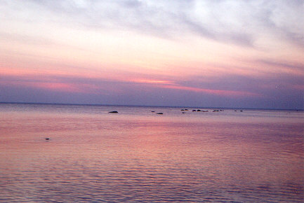 Wenig später fängt auch der Angler zu meiner Rechten eine kleine Meerforelle und gegen 18.00 Uhr endlich der ersehnte Ruck bei mir ! Leider verabschiedet sich der Fisch gleich beim ersten Sprung wieder. Er war blank und stark und hatte um 55cm. Sehe gegen 20.30 Uhr weit draußen noch einen Fisch springen, fange heute jedoch nichts mehr. Unten: Sonnenuntergang bei Levka. |