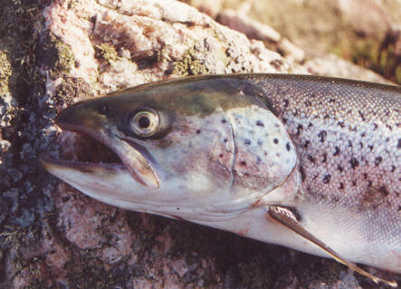 | Das Ergebnis ist dem Wetter entsprechend recht dürftig ausgefallen, rund 400 Teilnehmer fingen ganze 40 Meerforellen, eine Regenbogenforelle und einen Dorsch. Also nicht mal 11% der Leute (oftmals wirklich Experten !!!) fingen ihren Fisch. Ein Drittel der Fische war nur knapp über dem Mindestmaß von 40cm und hätte meines Erachtens eigentlich fairerweise zurückgesetzt werden müssen. Außerdem waren wieder einige stark gefärbte Fische darunter. Aber egal, es gab ja für jeden Fisch einen Preis! Eine Handvoll guter Fische waren auch dabei, aber wohl keiner über 3,5 kg (an die 80cm) und eine sehr starke Regenbogen. | ![]() |