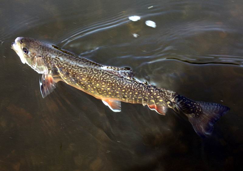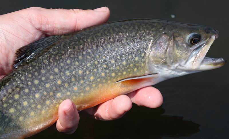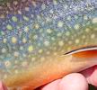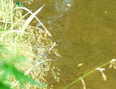 | Am nächsten Tag fingen wir neben Bachforellen und Döbeln eine ganze Reihe wunderschön gefärbter, kampfstarker Bachsaiblinge. Die Bachforellen lassen sich übrigens nicht nur mitten im Fluss ansprechen, sondern gerade auch an warmen Sommertagen unter den Uferbäumen oder direkt nur wenige cm vom Ufersaum entfernt. Deshalb sollte man an einer halbwegs fischverdächtigen Stelle keineswegs achtlos vorbeiwaten. Der Fluss weist übrigens einen immensen Bestand an Brutfischchen auf, ebenfalls gibt es Koppen. Große Bachforellen (und andere Räuber) müssen sich hier fühlen wie im Schlaraffenland. |