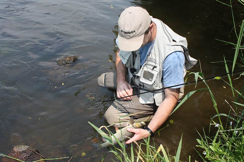 Anschließend ging es wieder auf Rapfen-Jagd - teilweise von Erfolg gekrönt - und am Abend zum "Abendsprung" in den obersten Streckenabschnitt. Am letzten, wiederum sehr heißen Tag, gesellten sich noch Barsche zu den von uns gefangenen Fischarten hinzu. |