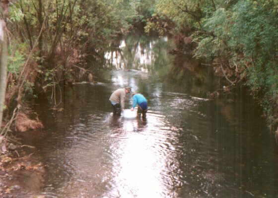 Vereinsmitglieder beim regelmäßigen Besatz und beim Pflanzen von flutenden Hahnenfuß