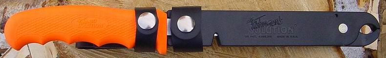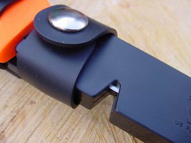 Die Messerscheide aus stabilem Kunststoff lässt sich nach dem Lösen eines Druckknopfes am Zapfen drehen und bis zu 5 cm weit öffnen, sie ist dann als Klemmvorrichtung (Zange) nutzbar, z.B. um Fische zum Verarbeiten sicher an Kopf oder Schwanz festzuhalten, zum Enthäuten, aber auch als Greifer beim Hakenlösen. Außerdem besitzt sie die Messerscheide 4 Druckknopfhalterungen, eine Gürtelschlaufe, einen integrierten Messer- und Angelhakenschleifstein und eine praktische Angelschnur- Schneidevorrichtung - ohne dabei das Messer zücken zu müssen. |