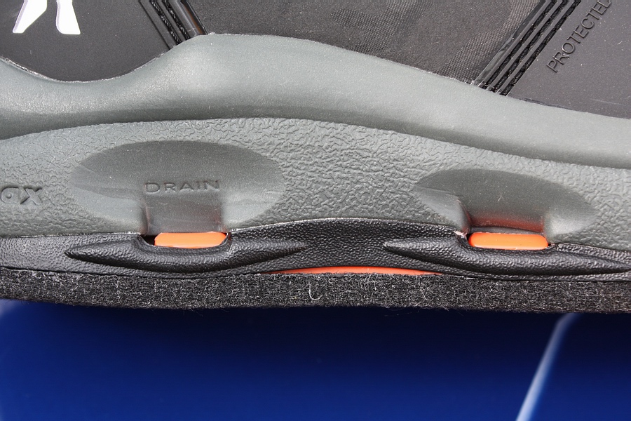 Besonderes Augenmerk legten wir im Test natürlich auf die Wechselsohlen und deren Handhabung, sind sie doch das Markenzeichen dieses Watschuhes & Herstellers. Aber hier hatte uns bereits der Vorgänger 100% überzeugt und beim DarkHorse war es erwartungsgemäß nicht anders. Mitgeliefert werden hier 1 x Filz und 1 x kreuzprofilierte Kling-On Gummisohlen (zusätzlich sind im Zubehörkauf weitere Wechselsohlen erhältlich, auch solche mit Spikes). Über ein Verschlusssystem von vorderer "Rasterlasche", sechs seitlichen Verriegelungen und hintererer Gummilasche werden alle diese Sohlen absolut sicher und weitgehend frei von Fremdkörper-Eindringen in Sekundenschnelle gewechselt und im Sohlenbett eingerastet. Einmal montiert, sitzen sie bombenfest, sind vollständig trittsicher und lösen sich auch im schwierigen Gelände oder unter harter Beanspruchung nicht ungewollt. Die verschiedenen Sohlentypen stellt sich der Fischer je nach Gewässeruntergrund und Laufkomfort ganz so zusammen, wie benötigt. |