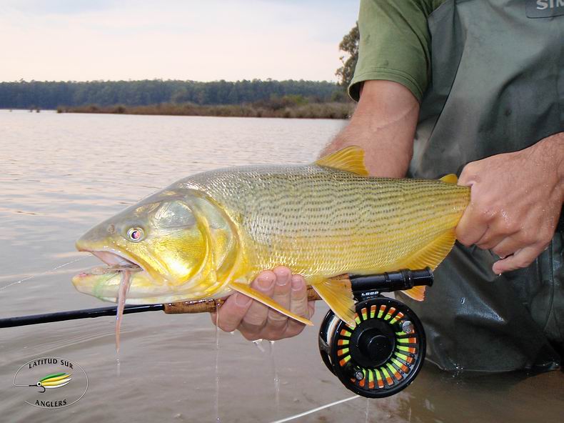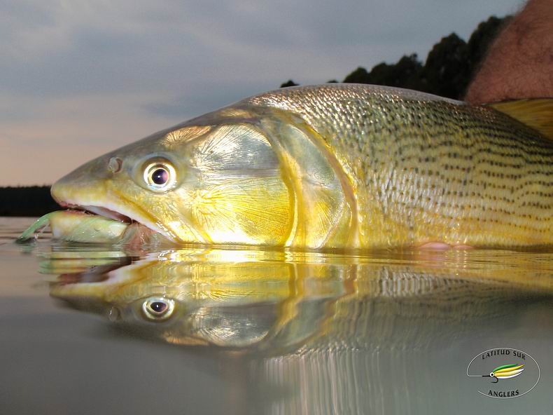 Die einschlägigen Artikel der außereuropäischen Printmedien, zahlreiche Videos und Bilddokumentationen zeigen diesen Fisch in den großen Flussläufen Argentiniens oder in den kleineren Gewässern in den Niederungen der Yungas, den kalten Regenwäldern zur Grenze Boliviens. Tiefe Gumpen, Strauch- und Totholz, verblockte Ufer und die Correderas selbst, die Stromschnellen, das sind die bevorzugten Jagdreviere des Dorados. Ganz einfach also, mit oder ohne Boot, die heißen Zonen sind für den etwas erfahreneren Angler relativ leicht zu erahnen. Selbst die Fliegenwahl ist keine allzu komplizierte Sache: große Streamer im Muddlerstil, Deceiver, eben alles was sichtig ist und ordentlich Wasser verdrängt. Ok, da gibt es Ausnahmen, bei denen wir die Dorados auf Sicht befischen, unter anderem im Rio Corriente, wo schon einmal ein Surubi beim unbedarften Waten vergrämt wird und die Fliegenwahl ein bisschen “tricky” sein kann, eben auf Grund des klaren Wassers. |
