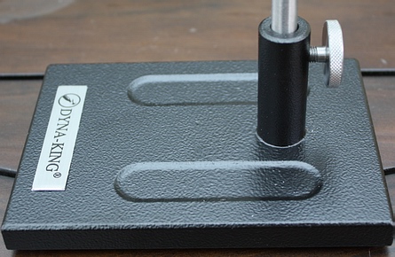 Zubehör: Alle Dyna-King Bindestöcke kommen mit schwerer Bodenplatte, verfügbar sind jedoch auch zwei verschiedene Tischklemmen mit Schaft-Verlängerung: |