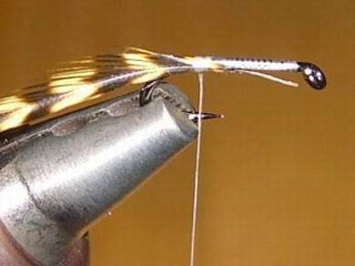 | Ein Stück Elchhaar hinter dem Hakenöhr einbinden. | Mit sorgfältigen Windungen sichern und Abschlussknoten machen. |