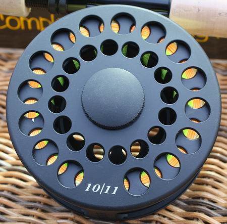 Emerger #10/11 Fliegenrolle: Leichte und einfache Großkernfliegenrolle aus Aluminium Druckguss und mit offener Rahmenkonstruktion, salzwasserfest mattschwarz eloxiert. Sehr gute Gehäuseplatzausnutzung. Die mit durchgehenden Lochkränzen versehene Spule, Spulenkern, Spulenboden und Gehäuse sorgen für eine Gewichtsreduzierung wie auch für eine gute Belüftung der Rolle. Zwei schmale Front- und Heckstege, zweifach von Außen angeschraubter Rollenfuß, gummierte Kunststoff-Kurbel & Kontergewicht. Gute Bremse, komplett verkapselt, schneller Spulenwechsel durch klassische Einhebeltechnik. Edelstahlachse und mehrfach gelagerte Spule mit leicht übergreifendem Rand. Ruhiger und tadelloser Spulenrundlauf, ordentliche Verarbeitung, nur geringe Toleranzen und zuverlässiger Betrieb, nahezu perfekte Balance. Etwas Spiel der Spule auf der Achse (1 mm) und ein minimales seitliches Kippeln. Bei Schnurabzug ertönt ein dezenter Klicker, der Schnureinholvorgang erfolgt komplett Geräusch- und Widerstandslos. Rollendurchmesser 123 mm, Rollenbreite 52 mm (bzw. 84 mm inkl. Kubel & Bremsrad), Gewicht der komplett bespulten Rolle: 400 Gramm. |