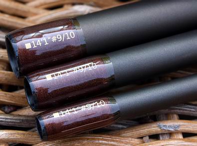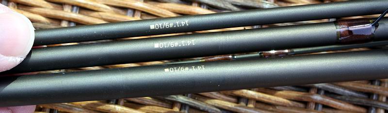 Emerger Fliegenrute: Vierteilige Fliegenrute, Länge 14‘1“ Fuß (427,5 cm), (WF-)Schnurklasse #9/10, Schusskopf-Wurfgewicht 31-33 Gramm. Dunkelolivfarbener Blank aus "36T Carbon", unlackiert matt gehalten, hellbraune halbtransparente Ring- und Zierbindungen, goldene Zierwicklungen, 12 abgestufte Pacific Bay Ringe in schwarzer Optik (2 gefütterte Leitringe, 9 Schlangenringe, Spitzenring), Fliegenöse überm Griff, zweiteiliger, insgesamt 62 cm langer, verjüngter Zweihandrutengriff aus Korkscheiben um 15 mm in mittlerer bis guter Qualität, Abschlüsse aus Composite Kork an beiden Griffenden, schwarz eloxierter, salzwasserfester Aluminium-Schraubrollenhalter, mit massiven Schubteil und Doppelmuttertechnik, aufwärts wirksam und mit einem Gesamtschraubweg von 46 mm. Vier gleichlange Rutenteile a. 113 cm (= Transportlänge). Die oberen Enden der Einzelteile wurden abgedichtet, die Steckverbindungen greifen (v.u.n.o.) 82 mm, 82 mm und 74 mm ineinander und passen akkurat. Beidseitige Längen- und Schnurklassenbeschriftungen auf allen Einzelteilen erleichtern ein rasches Ausrichten beim Zusammenstecken der Rute und wirken dem Verwechseln von Einzelteilen verschiedener Ruten entgegen. Rutengewicht: 292 Gramm. |