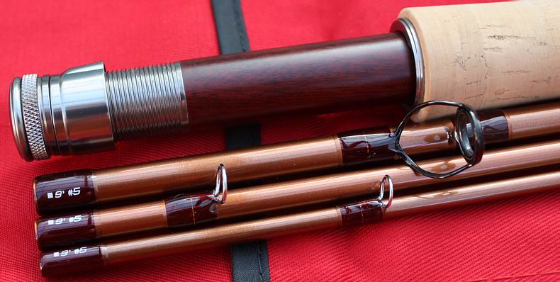 Teilung, Maße und Daten: Vierteilige Fliegenrute, Länge 9'0" (zusammengesteckt und nachgemessen 276 cm), vier nahezu gleichlange Teile a. 72,5 cm. Angegebene Schnurklasse: #5, angegebenes Schusskopf-Wurfgewicht: 11-13 Gramm / 170-200 grains. Das Gewicht der Rute beträgt 89 Gramm. Blankdurchmesser über dem Griff: 8,7 mm. Blankdurchmesser an der Rutenspitze: 1,6 mm. Länge Transportrohr: 80,5 cm, Gewicht Transportrohr (leer): 565 Gramm. Ausstattung: Geschliffener, lackierter Blank aus hochmodulierter Kohlefaser, Farbe Metallic-"Rust", gut passende Überschubverbindungen, mit kleinen weißen Punkt-Markierungen und Beschriftungen der Einzelteile zum schnelleren Ausrichten beim Zusammenstecken. Die Verbindungen greifen jeweils um 48 mm ineinander. Die Oberseiten der einzelnen Teile wurden gegen eindringenden Schmutz, Nässe etc. abgedichtet. Beringung: Handteil ohne Beringung, mit feststehender Fliegeneinhängeöse in Rollenflucht, Teil 2 mit zwei abgestuften, gunsmoke anodisierten Dreifußringen mit Hardloy Einsätzen, Teil 3 mit drei abgestuften Einstegringen, Spitzenteil mit vier Einstegringen und dem Spitzenring. Die Ringdurchmesser und Drahtstärken sind der Schnurklasse gut angepasst. Alle Einstegringe sind superhart verchromt. Ringbindungen in dunklem Weinrot und Halbtransparent. Dezente, kupferfarbene Zierwicklungen an allen Rutenteilen. Alle Bindungen wurden gründlich bis reichlich lackiert. |