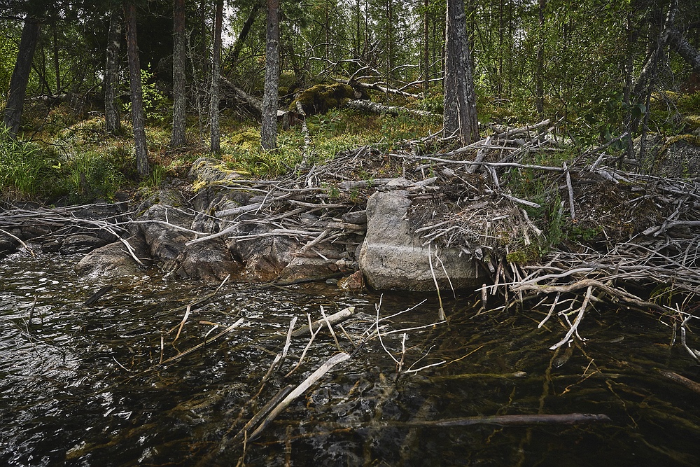 | Gestartet in drei Booten von Roland angeführt, fuhren wir zu den ersten Spots. Sofort hätte jeder wohl gern seine Fliege platziert. Binsen, ein flach verlaufender Einstiegt aus Stein mit einer steilen Unterwasserkante. Man konnte die Barsche und Hechte schon an der Rutenspitze spüren, obwohl man nicht mal eine Rute in der Hand hielt. Roland hatte zuvor jeden Spot gefischt und Instruktionen vom heimischen Fischer erhalten, wo es hot ist. Roland… ja? einen Wurf, bitte!!… einen!!.. okay!... es wurden dann 2 Würfe und 2 tolle Barsche auf Anhieb mit einem kleinen Streamer. So kann es laufen dachte ich, damit war mein Tag gerettet. Aber es war die erste Stelle, die wir anfuhren und es ging weiter. Die Weitläufigkeit erlaubt bei viel Erklärung keine langen Aufenthalte und wir sollten noch einige Inseln und einen imposanten Biberbau kennenlernen. Dieser erstreckte sich gewaltig unter Wasser. Das glassklare Wasser ließ es zu, die für den Winter als Vorrat gesammelten Äste deutlich zu erkennen. Leider waren die Biber nicht so zeigefreudig und versteckten sich vor uns. |